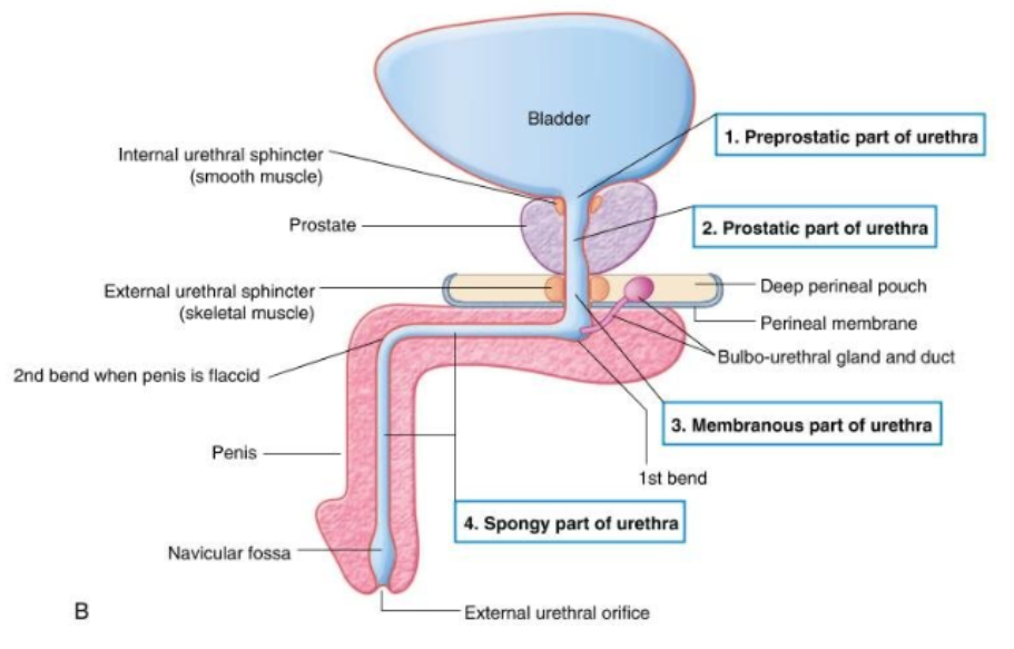 Longer urethra, passes inferiorly through the prostate, through the deep perineal pouch and perineal membrane and enter the root of the penis (divided to preprostatic, prostatic, membranous and spongy parts)