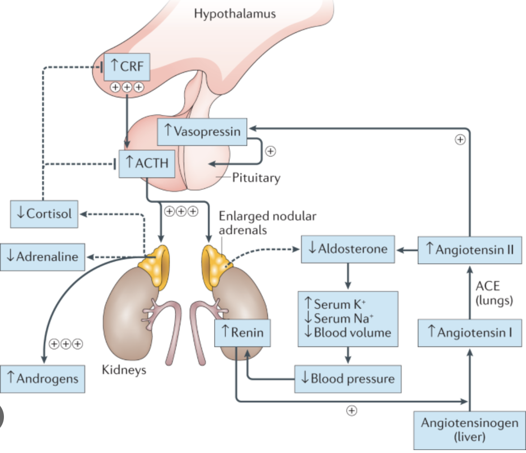 CAUSE: Genetic changes in the CYP21A2 gene and is inherited in an autosomal recessive pattern. Newborn screening is available in all 50 states of the US to test for this disorder at birth. The diagnosis is made based on the clinical symptoms, biochemical and genetic testing