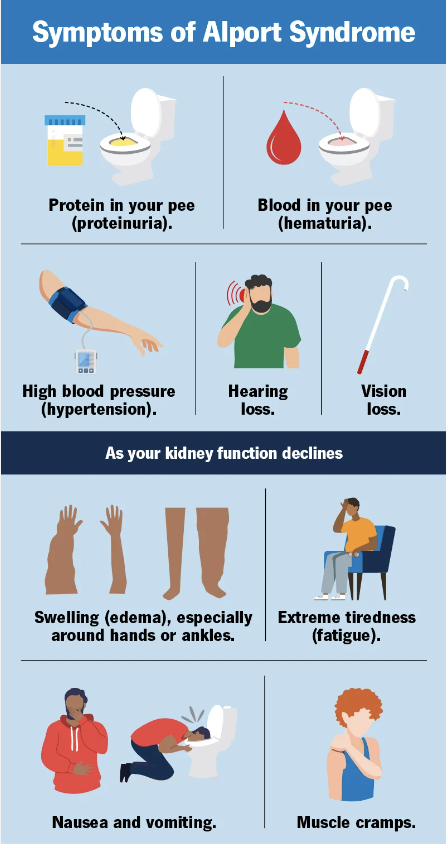 SYMPTOMS: Blood in the urine (hematuria), the most common and earliest sign of Alport syndrome.