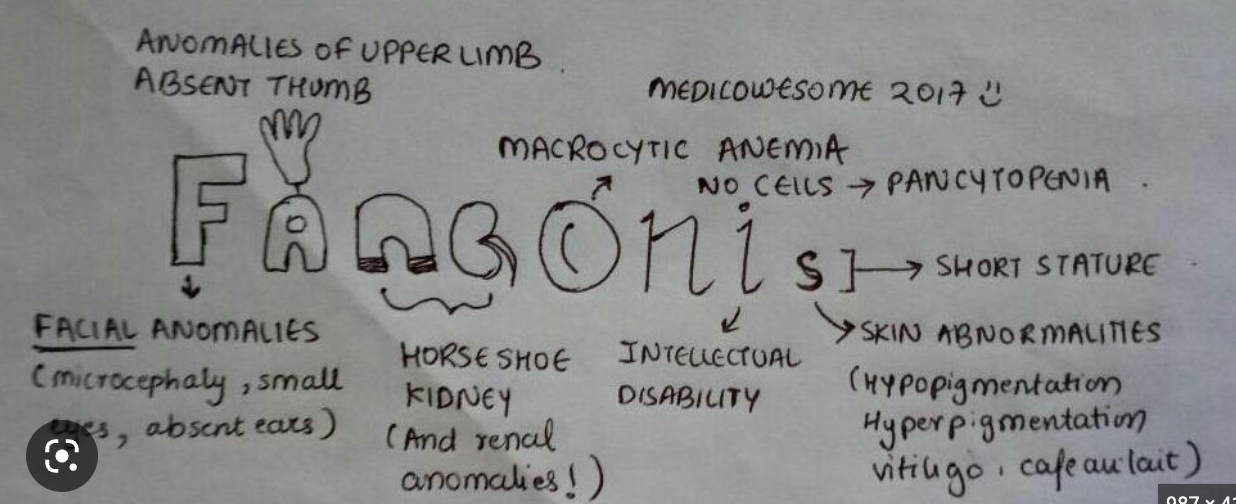 CAUSE: faulty genes, or it may result later in life due to kidney damage. Sometimes the cause of Fanconi syndrome is unknown. Common causes of Fanconi syndrome in children are genetic defects that affect the body’s ability to break down certain compounds such as: Cystine (cystinosis)