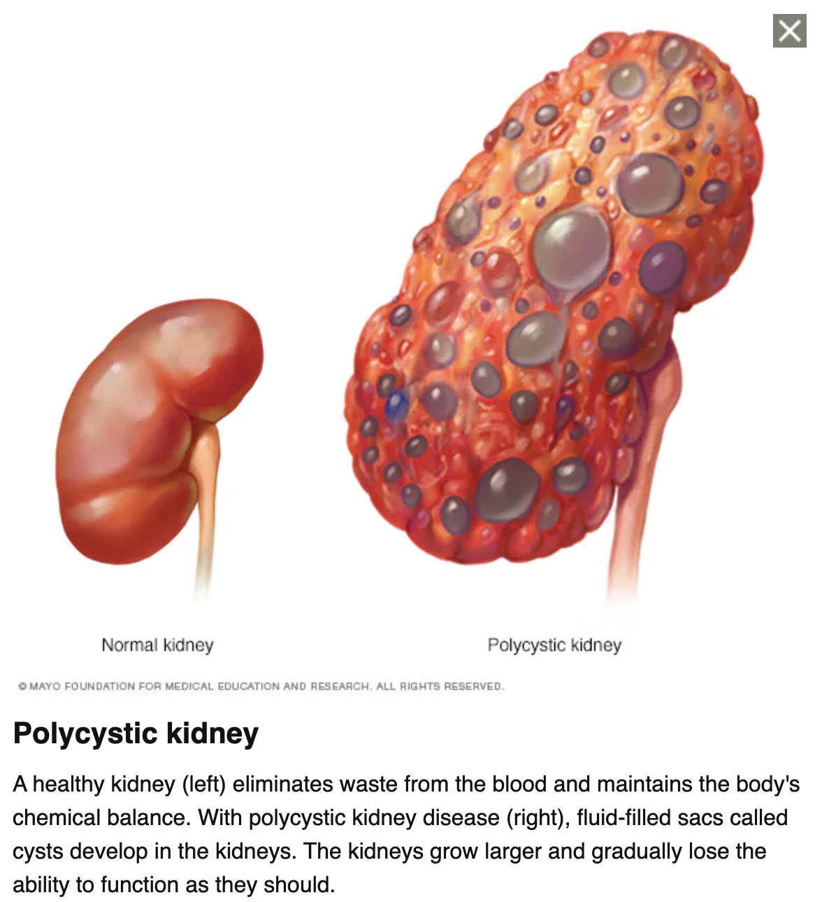 An inherited disorder in which clusters of cysts develop primarily within your kidneys, causing your kidneys to enlarge and lose function over time. Cysts are noncancerous round sacs containing fluid. The cysts vary in size, and they can grow very large. Having many cysts or large cysts can damage your kidneys.