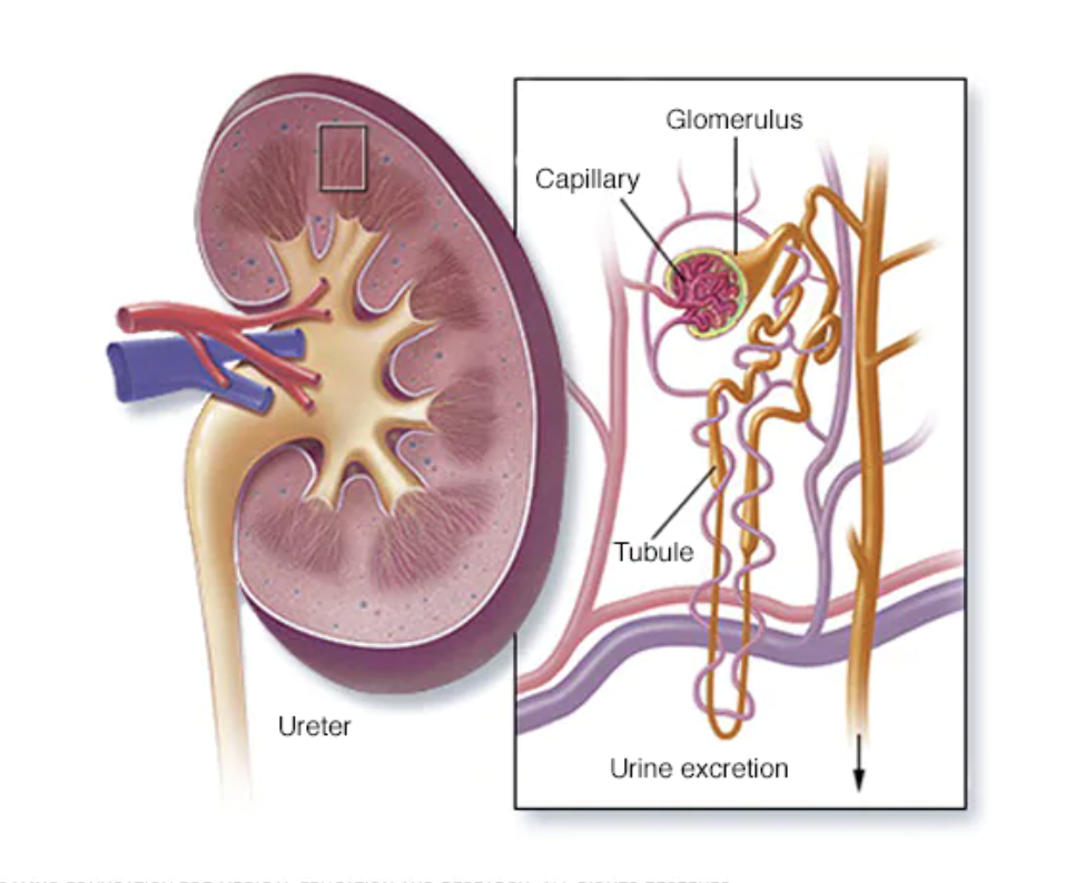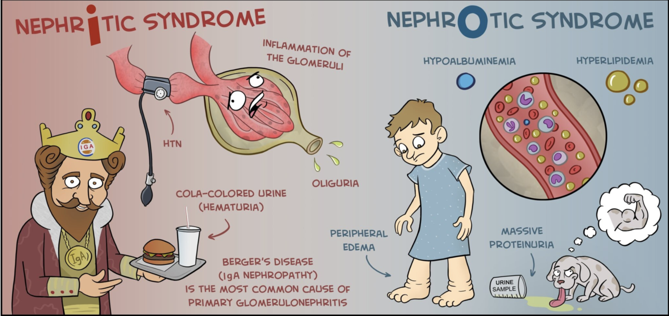 *Nephritic syndrome is characterized by inflammation of the glomeruli (glomerulonephritis) and renal dysfunction. The most common cause is immunoglobulin A (IgA) nephropathy, also known as Berger’s disease, but other causes include postinfectious glomerulonephritis and lupus nephritis. Nephritic syndrome can present with oliguria, hypertension, and hematuria (cola-colored urine). Edema may also be present, although it is not nearly as severe as in nephrotic syndrome. Laboratory findings include hematuria, proteinuria (< 3.0 g/day), elevated BUN and creatinine, and red cell casts in urine.