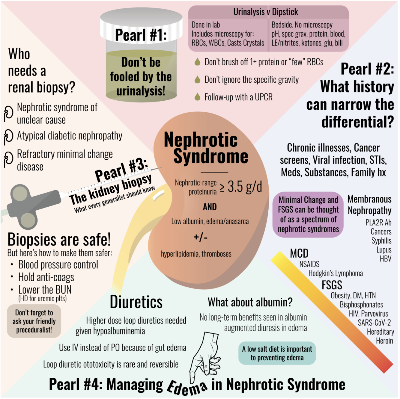 Nephrotic syndrome develops as damage to glomeruli results in massive proteinuria and generalized edema (anasarca). It can be caused by a variety of disorders in adults (e.g., diabetes mellitus, amyloidosis, systemic lupus erythematosus (SLE), and focal segmental glomerulosclerosis). The most common cause in children is minimal change disease. The edema of nephrotic syndrome decreases the amount of intravascular fluid and decreases blood pressure, stimulating the kidneys to release renin. Ultimately, the adrenal glands respond by releasing aldosterone to retain sodium and water, which provides more fluid to contribute to the further development of edema. Laboratory findings include hypoalbuminemia, massive proteinuria (> 3.5 g/day), hyperlipidemia, and waxy casts and oval fat bodies in urine.