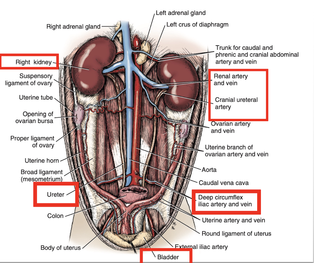 ventral midline incision-> dissect affected kidney and flip medially-> isolate renal artery, vein, ureter (transect artery first), remove all of ureter
