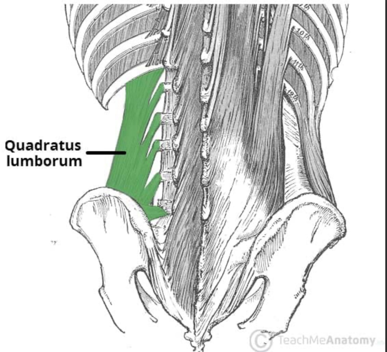 Attachments: Originates from the iliac crest and iliolumbar ligament. The fibres travel superomedially, inserting onto the transverse processes of L1 – L4 and the inferior border of the 12th rib.