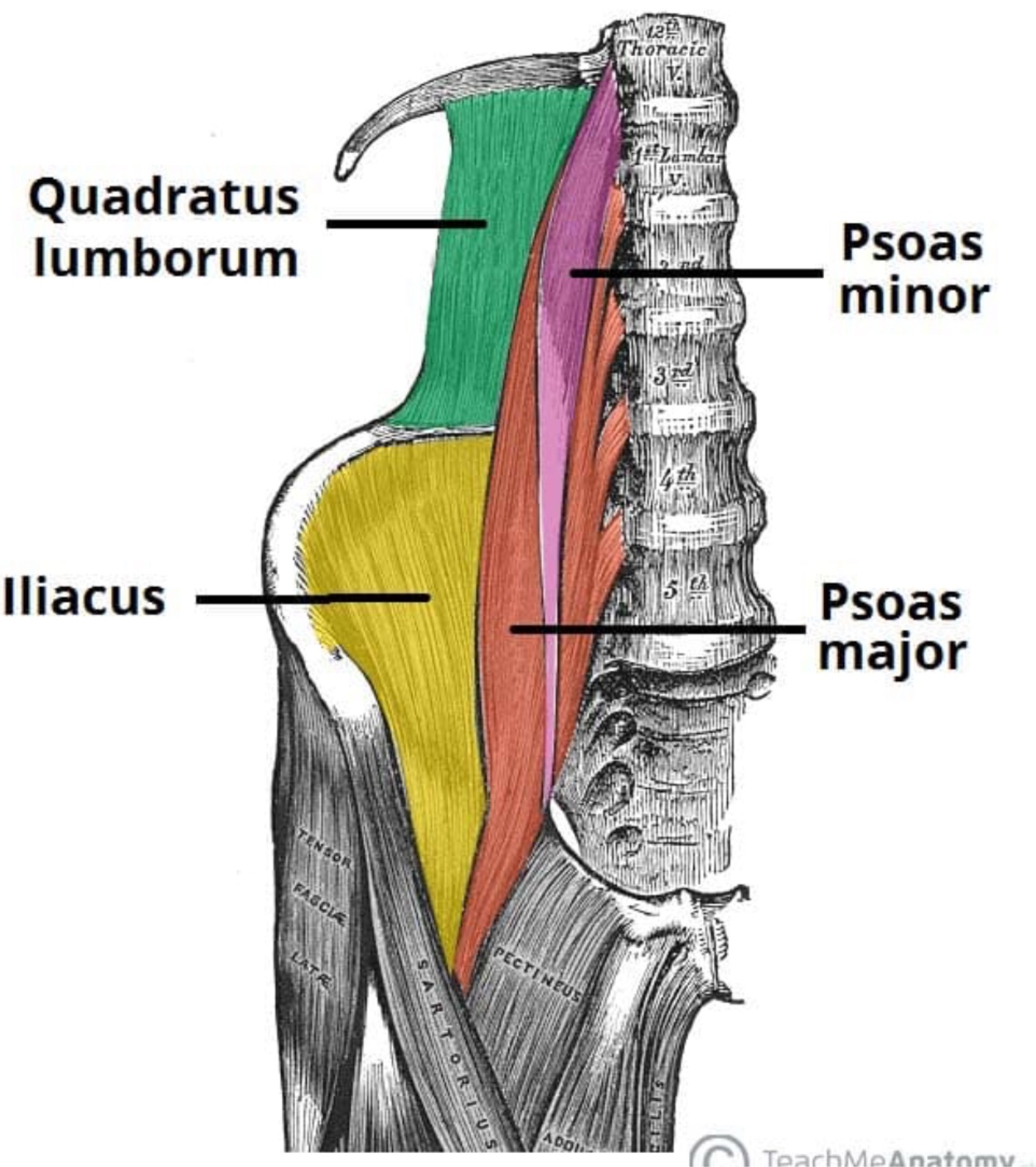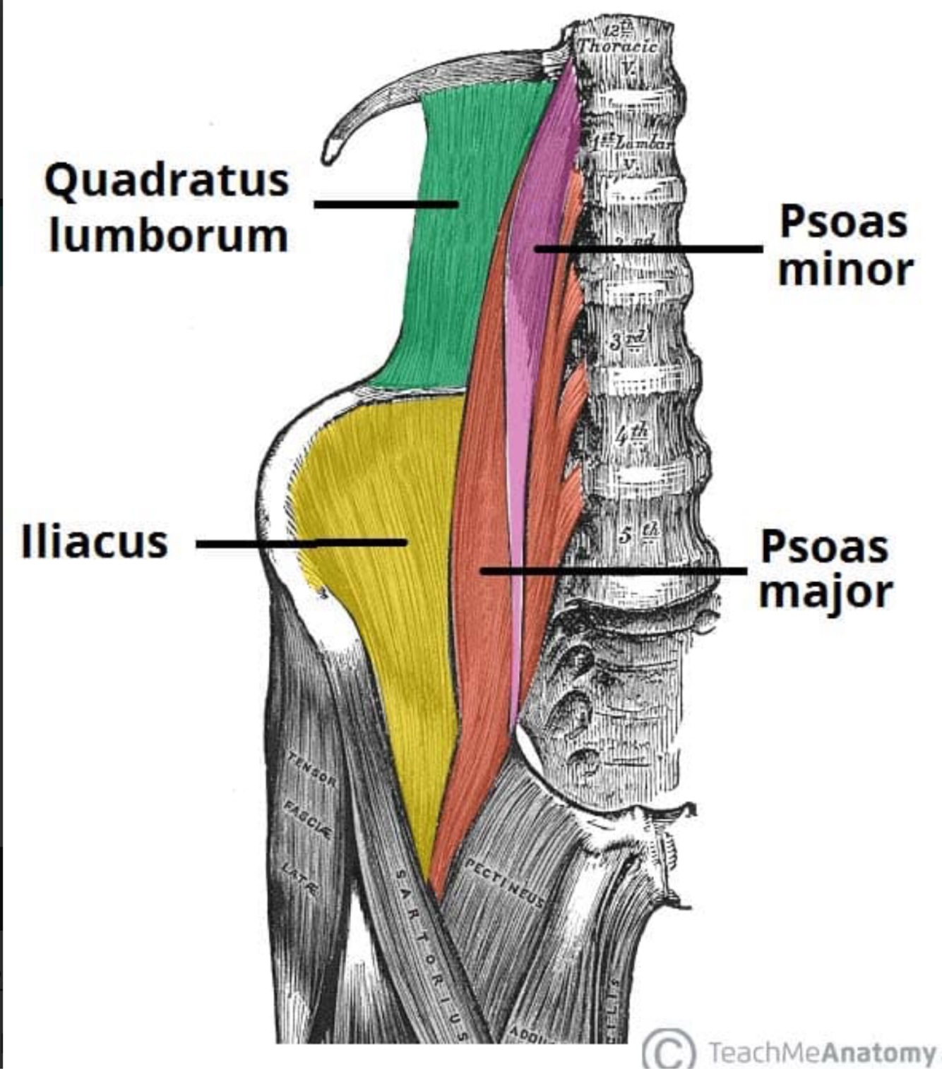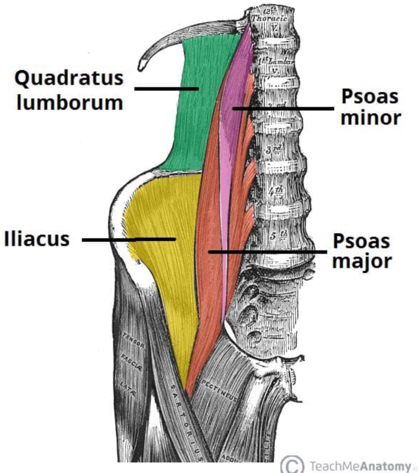 Attachments: Originates from the transverse processes and vertebral bodies of T12 – L5. It then moves inferiorly and laterally, running deep to the inguinal ligament, and attaching to the lesser trochanter of the femur.