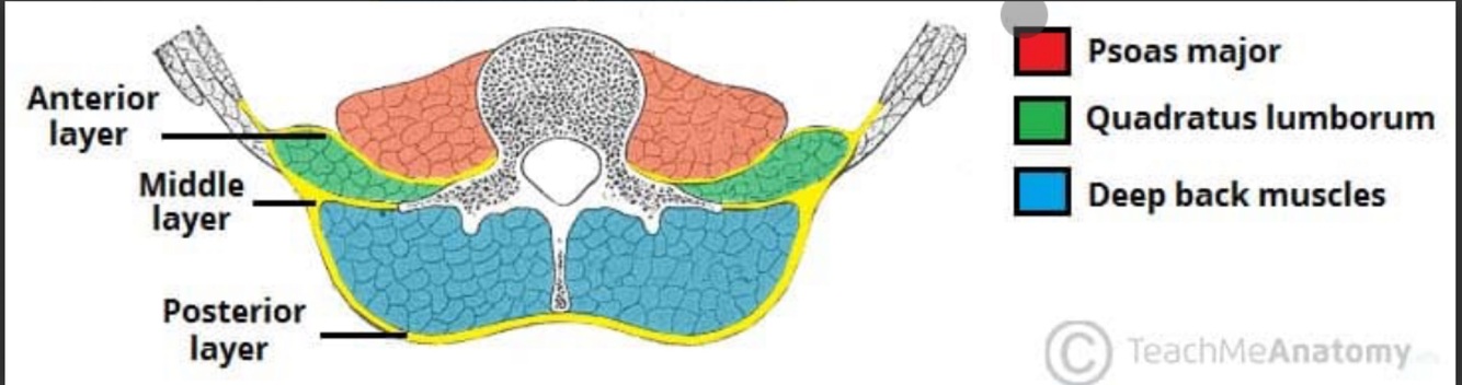- Quadratus lumborum – between the anterior and middle layers.