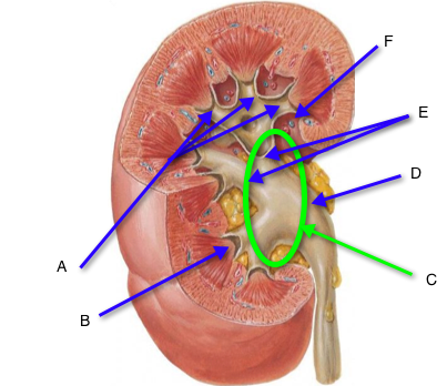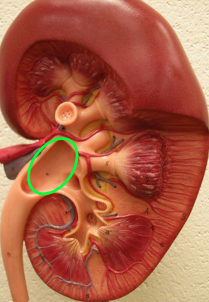 Renal Sinus - large space medial to hilum containing calices, blood vessels, renal pelvis, nerves and fat