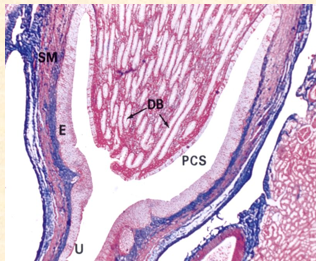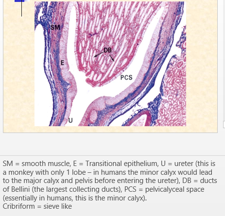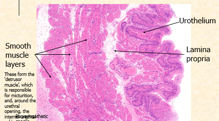 Lining of the conducting parts of the urinary tract. Stratified and found in 3-6 cell layers. Umbrella domed cells at the surface. This gives a very highly impermeable and inflexible membrane. Layers of smooth muscle below the epithelium.