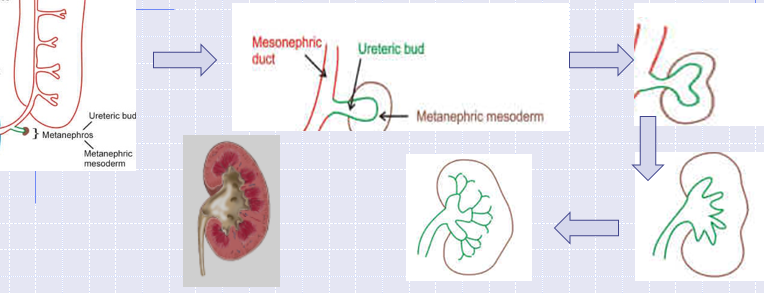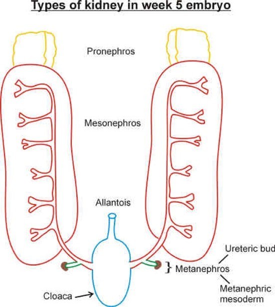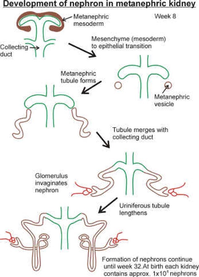 The metanephros starts to develop from about week 5 but starts to function around week 9