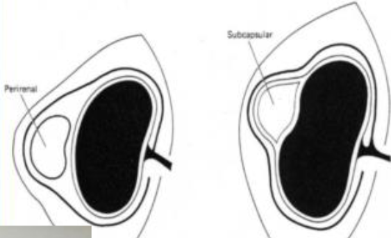 -Perirenal - may displace the kidney and can be