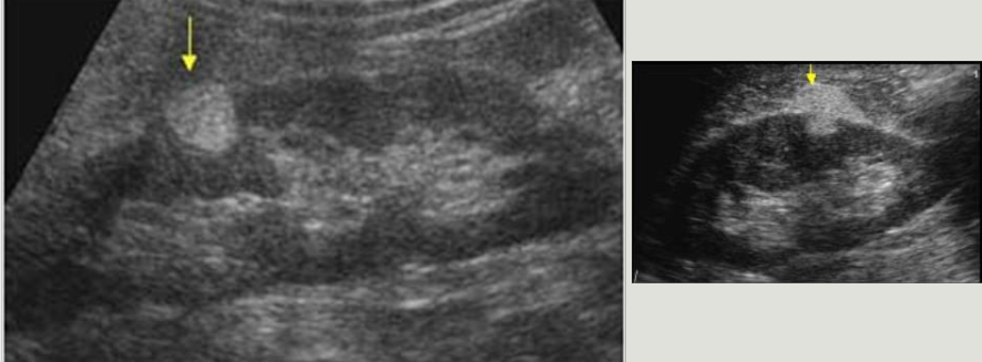 -Sonographically appears as a focal, solid, hyperechoic mass