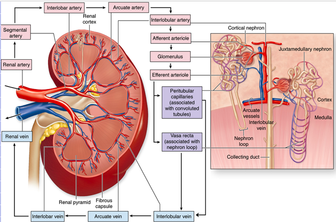 1) renal artery 2) segmental artery 3) interlobar arteries 4) arcuate arteries 5) INTERLOBULAR ARTERIES 6) afferent arterioles 7) glomeruli 8) EFFERENT ARTERIOLES 9) peritubular capillaries and vasa recta 10) interlobular veins 11) arcuate veins 12) interlobar veins 13) renal vein then out