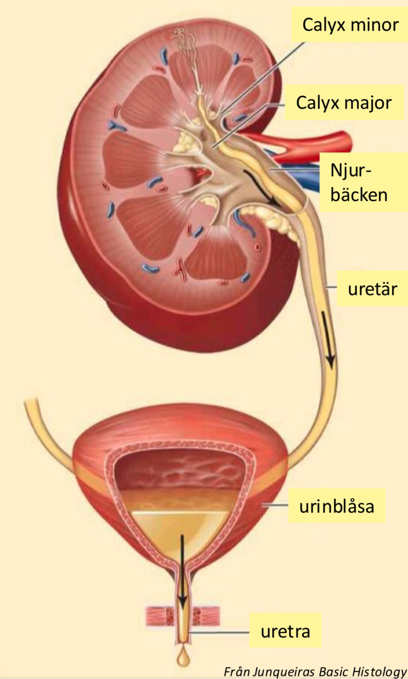 I anslutning till njuren samlas urinen först upp i calyx minor, som tömmer vidare i calyx major, och därefter i njurbäckenet; från njurbäckenet leds urinen ned i uretären (Ureter), vidare till urinblåsan där den lagras, och slutligen ut via urinröret (Uretra).