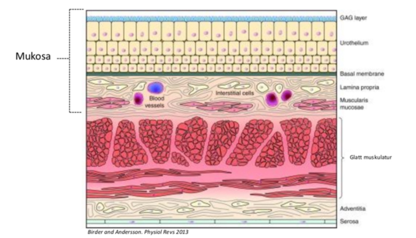 Urinblåsans vägg är uppbyggd i tre huvudsakliga lager: mukosa, detrusor och adventitia.