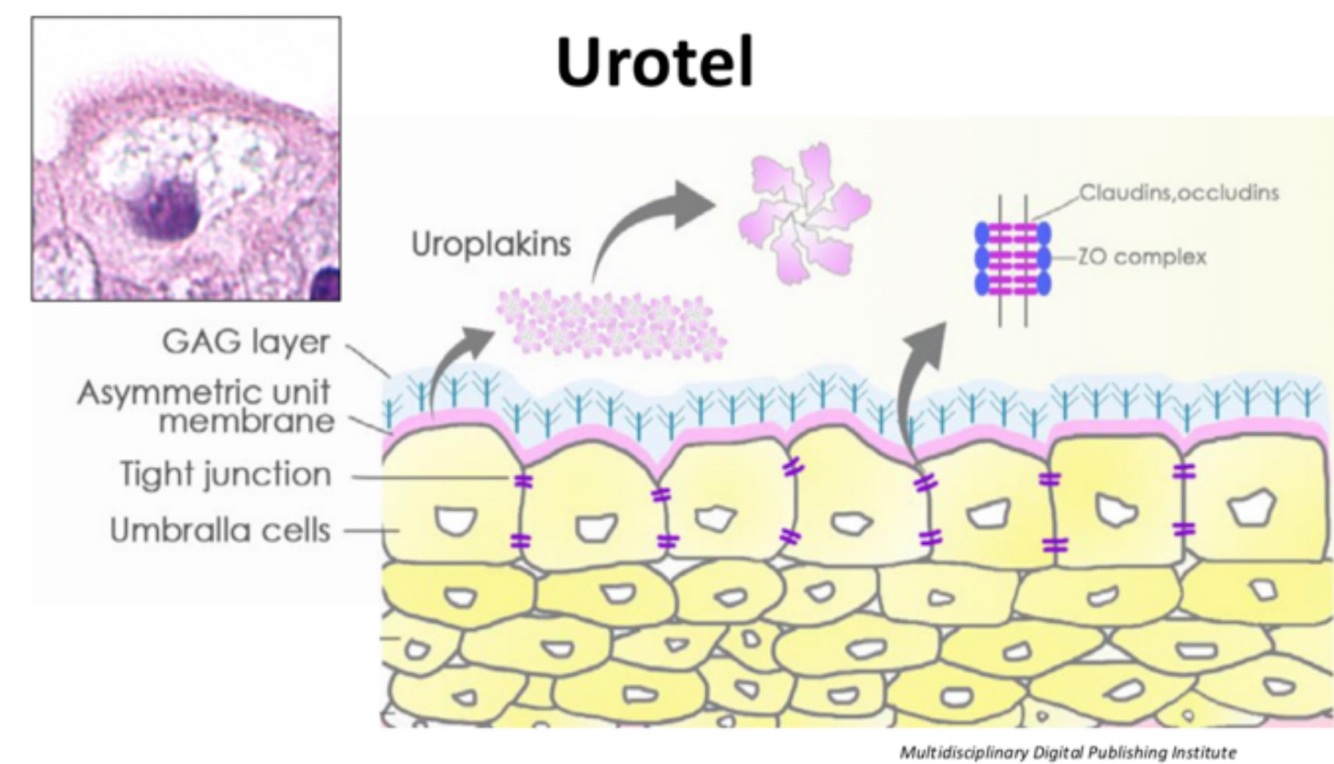Bildar en effektiv barriär genom tight junctions mellan cellerna —> luminala cellmembran är specialiserat med uroplakiner i en asymmetrisk enhetsmembranstruktur