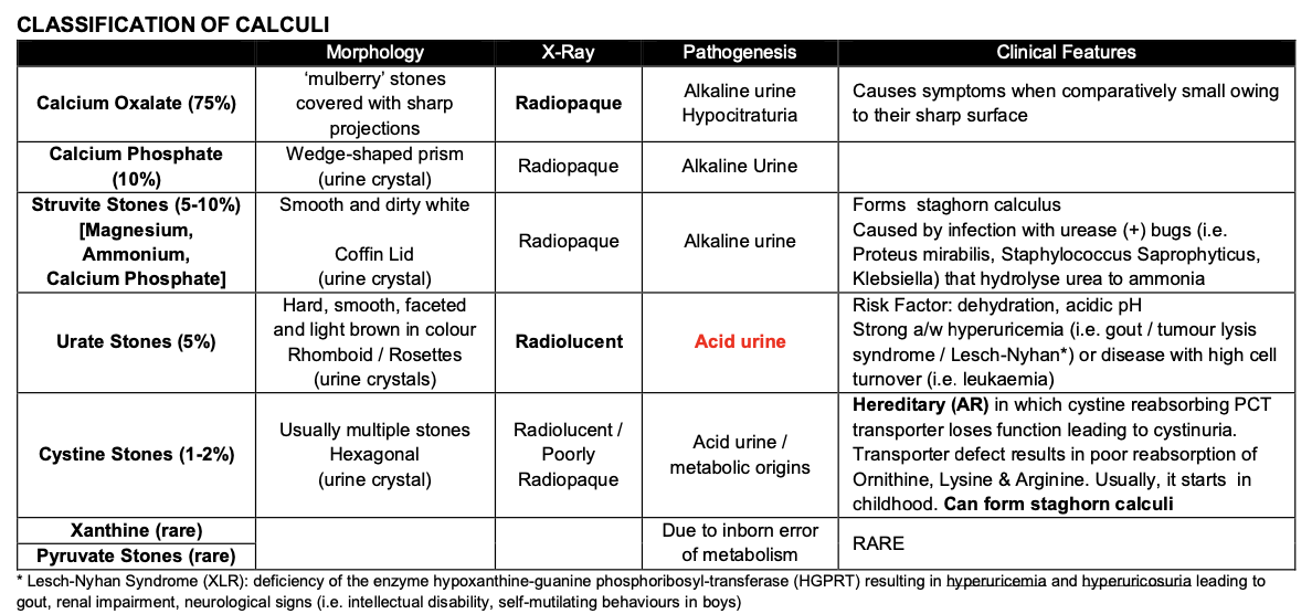 Types of calculi: X-Ray appearance, acidic/alkaline urine, clinical features