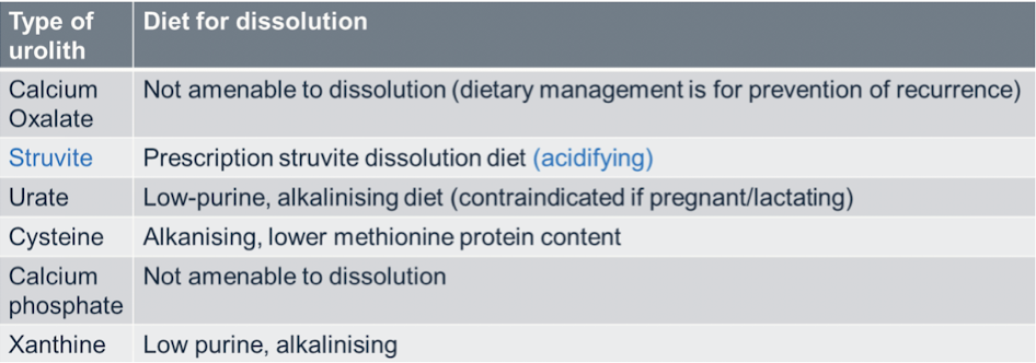 * Calcium Oxalate, Calcium phosphate, and larger Struvite uroliths (as will take a while to dissolve)