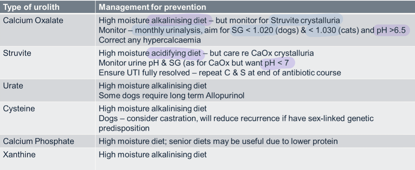 Really important – high rate of recurrence especially Calcium Oxalate – 50% of dogs reform uroliths in 2-3 years; 30% of cats