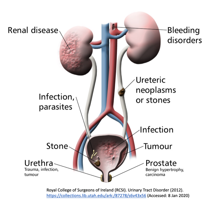 What are the 3 types of urinary disorders and give some examples of each
