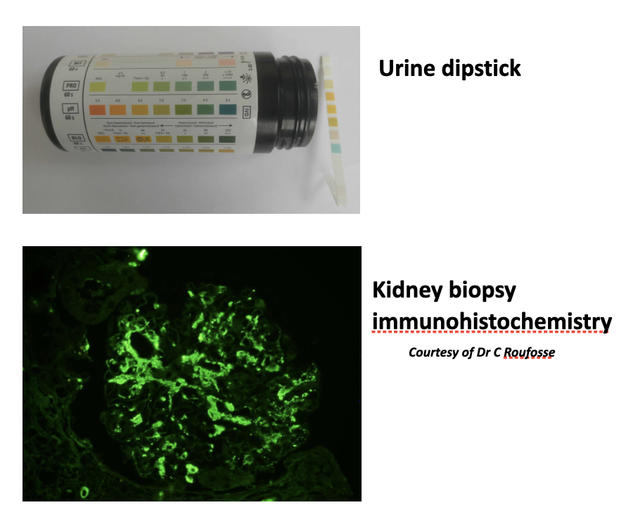 Haematuria and proteinuria, low serum protein, including albumin, in blood