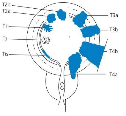 What does T4 stand for in staging bladder cancer
