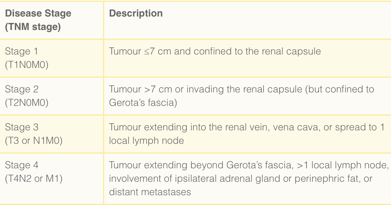 25% have metastasis at presentation. Survival for patients who have undergone nephrectomy is around 70% at 3 years and 60% at 5 years, however those with worse stage disease have a poorer prognosis.