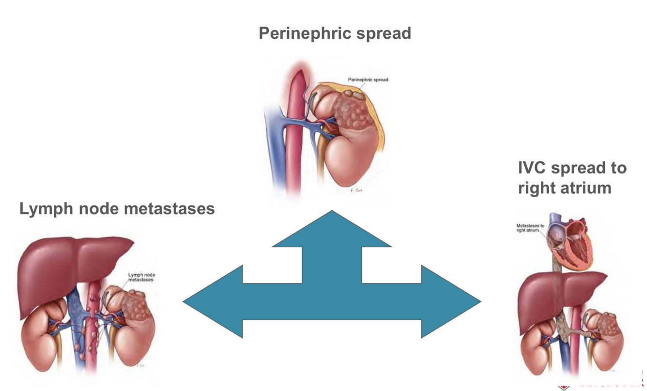 direct invasion: perinephric tissues, adrenal gland, renal vein* or the inferior vena cava
