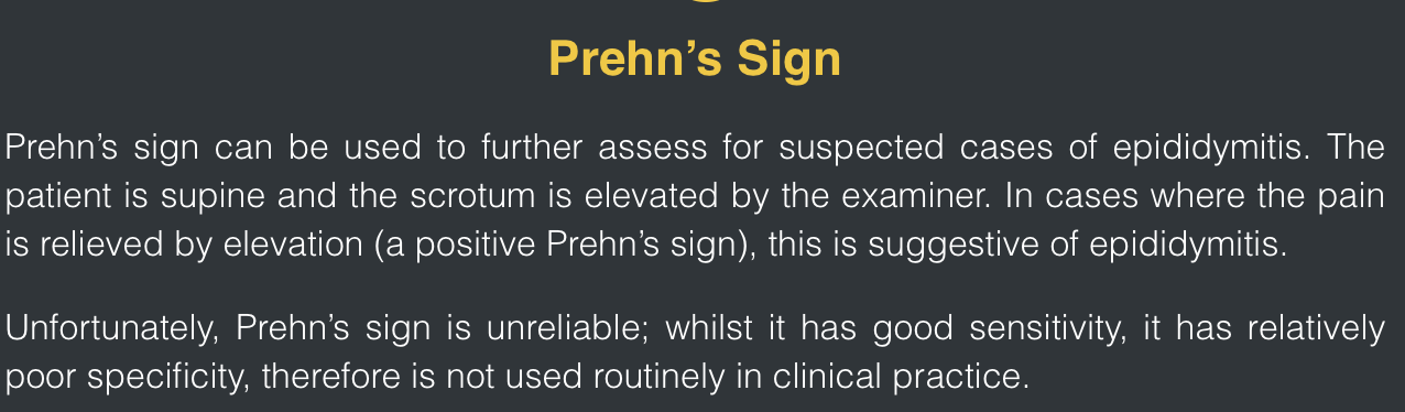pain continues despite elevation of the testicle, termed a negative Prehn’s sign (in epididymo-orchitis, Prehn’s test is often positive but this is an unreliable examination finding).