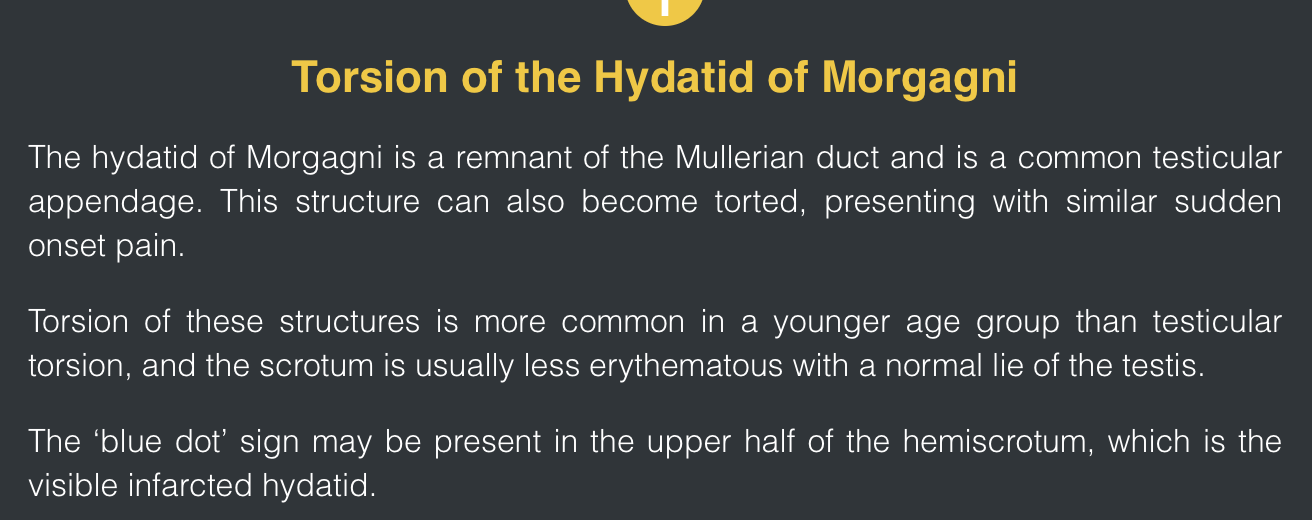 Other differentials to consider include trauma, incarcerated inguinal hernia, malignancy, renal colic, hydrocele, idiopathic scrotal oedema, and torsion of the hydatid of Morgagni.