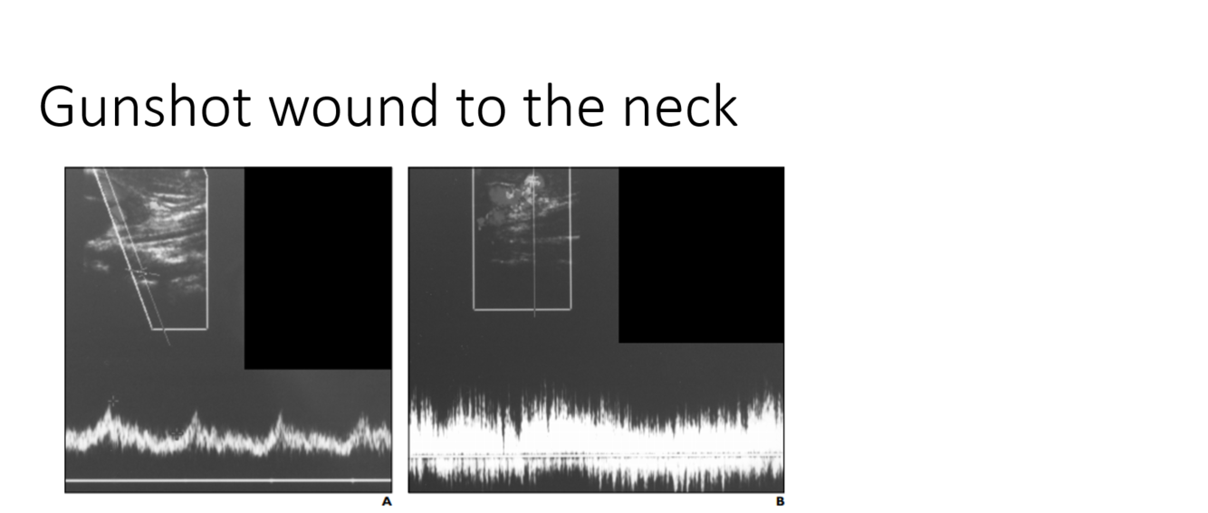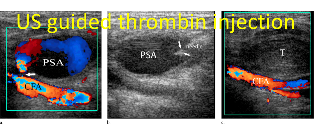 treatment = ultrasound guided thrombin injection. GOAL: introduce thrombogenic material under sonographic visualization to eleimate visible flow within the pseudoaneurysm sac