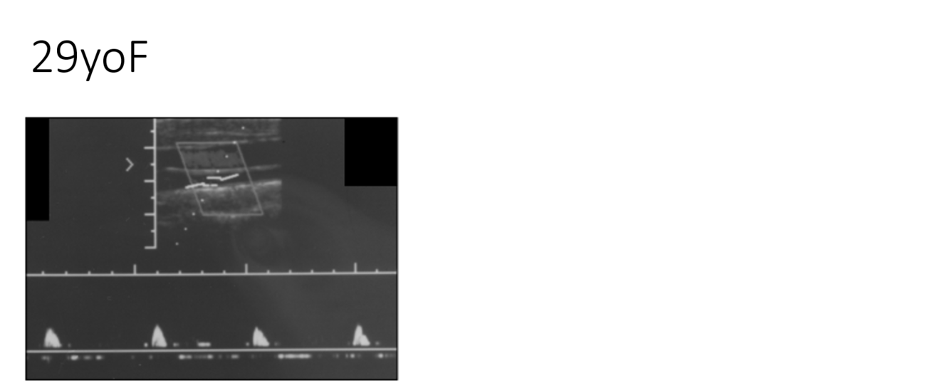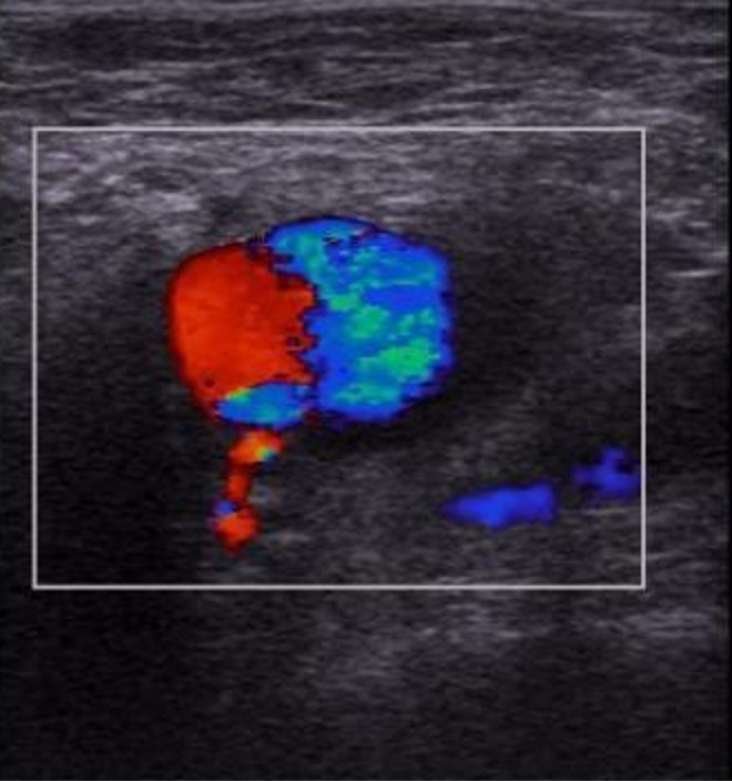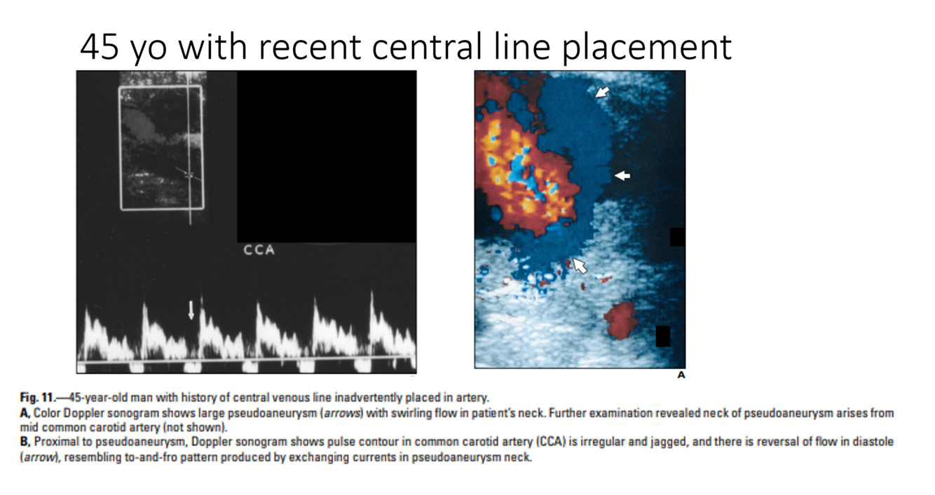 femoral artery pseudoaneurysm with classic “yin-yang” sign indicated to and fro flow into and out fo the pseudoaneurysm sac.