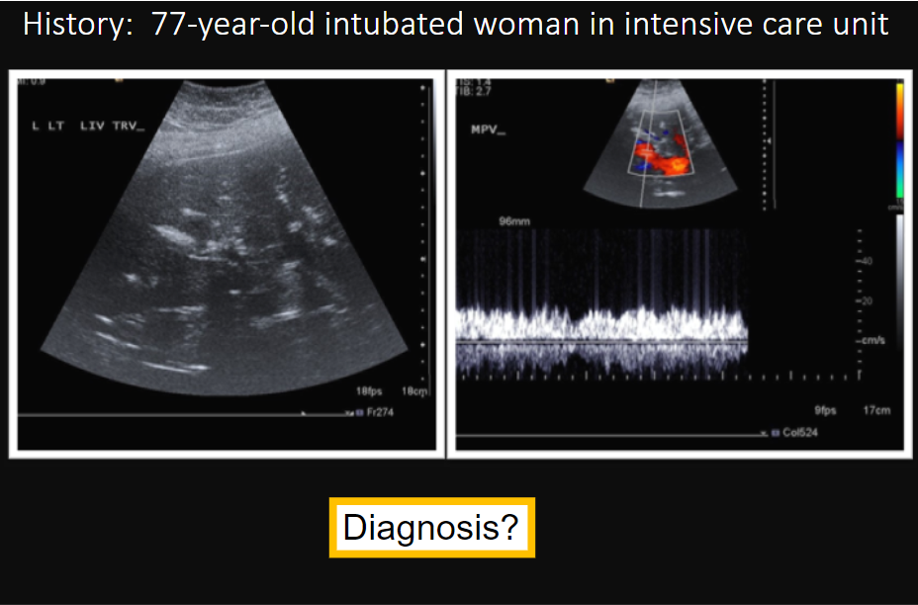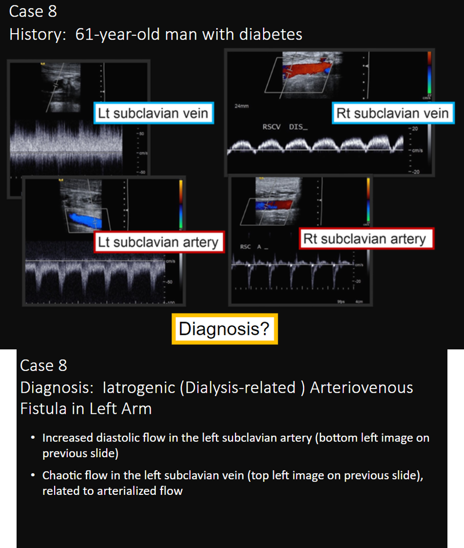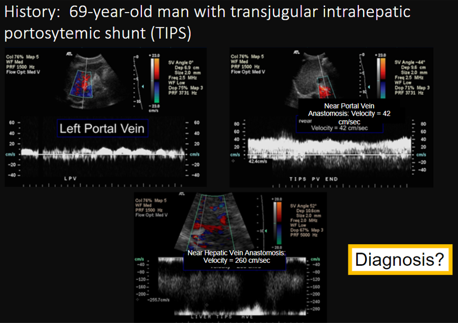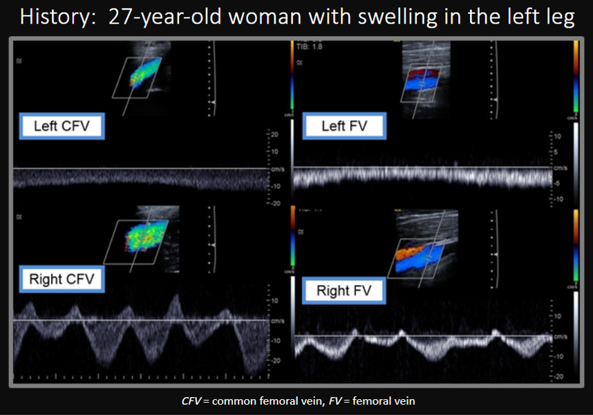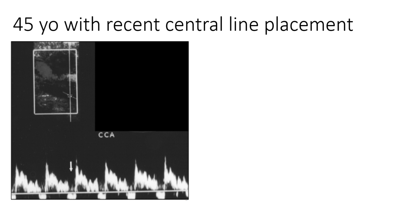 right groin US image with color doppler. What intervention did the pt likely have, diagnosis, and what is the treatment?