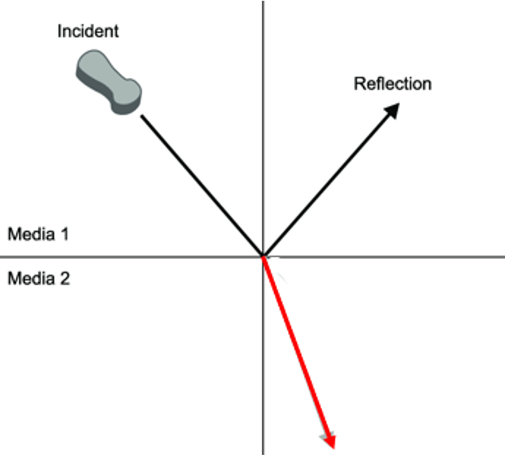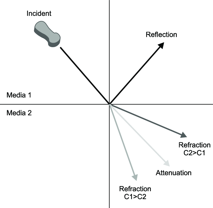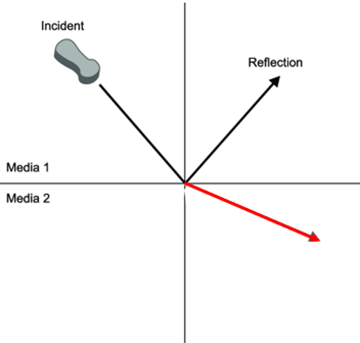 When the velocity of an ultrasound wave in media 1 is greater than that in media 2 (C1>C2), the angle of reflection is decreased, and when velocity of an ultrasound wave in the media 1 is less than in media 2 (C1 Use Snell’s law