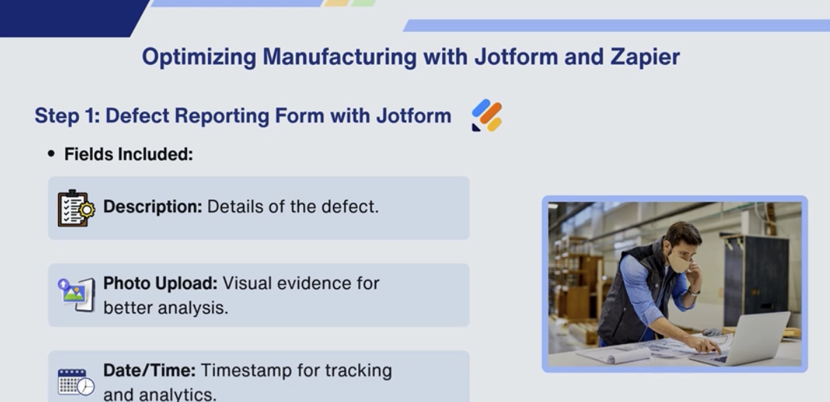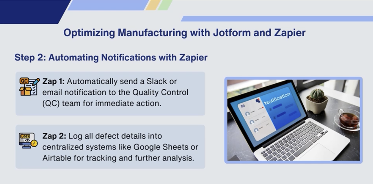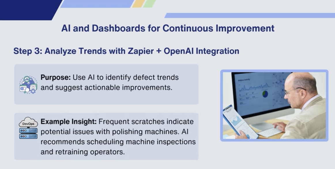 Zapier automatically triggers notifications and logs the defect data into Google Sheets for tracking.