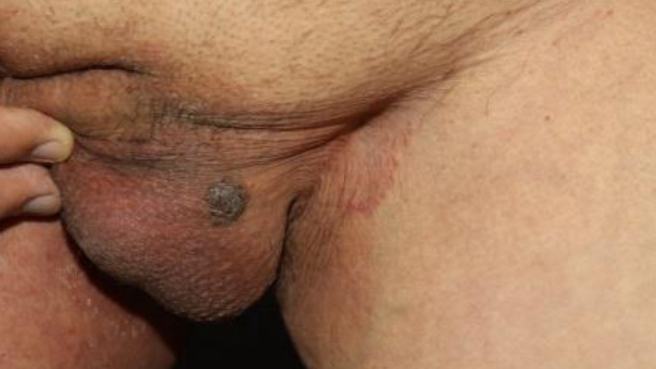 Tinea que atinge a região bilateral do períneo e poupa a região escrotal sem presença de lesões satélites