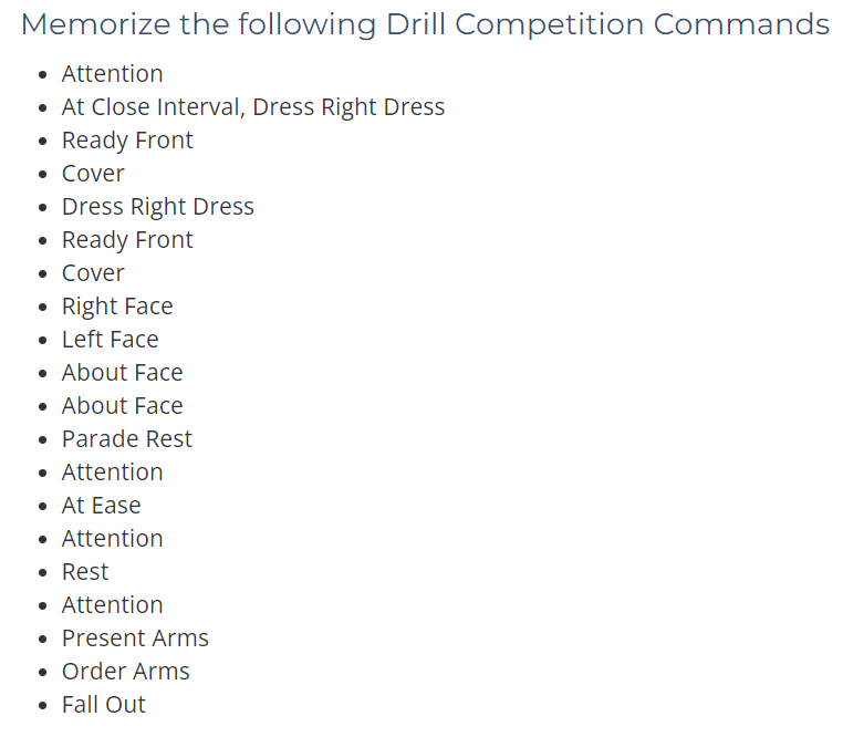 Name all the OBC Drill Competition Commands in the order we have been practicing.