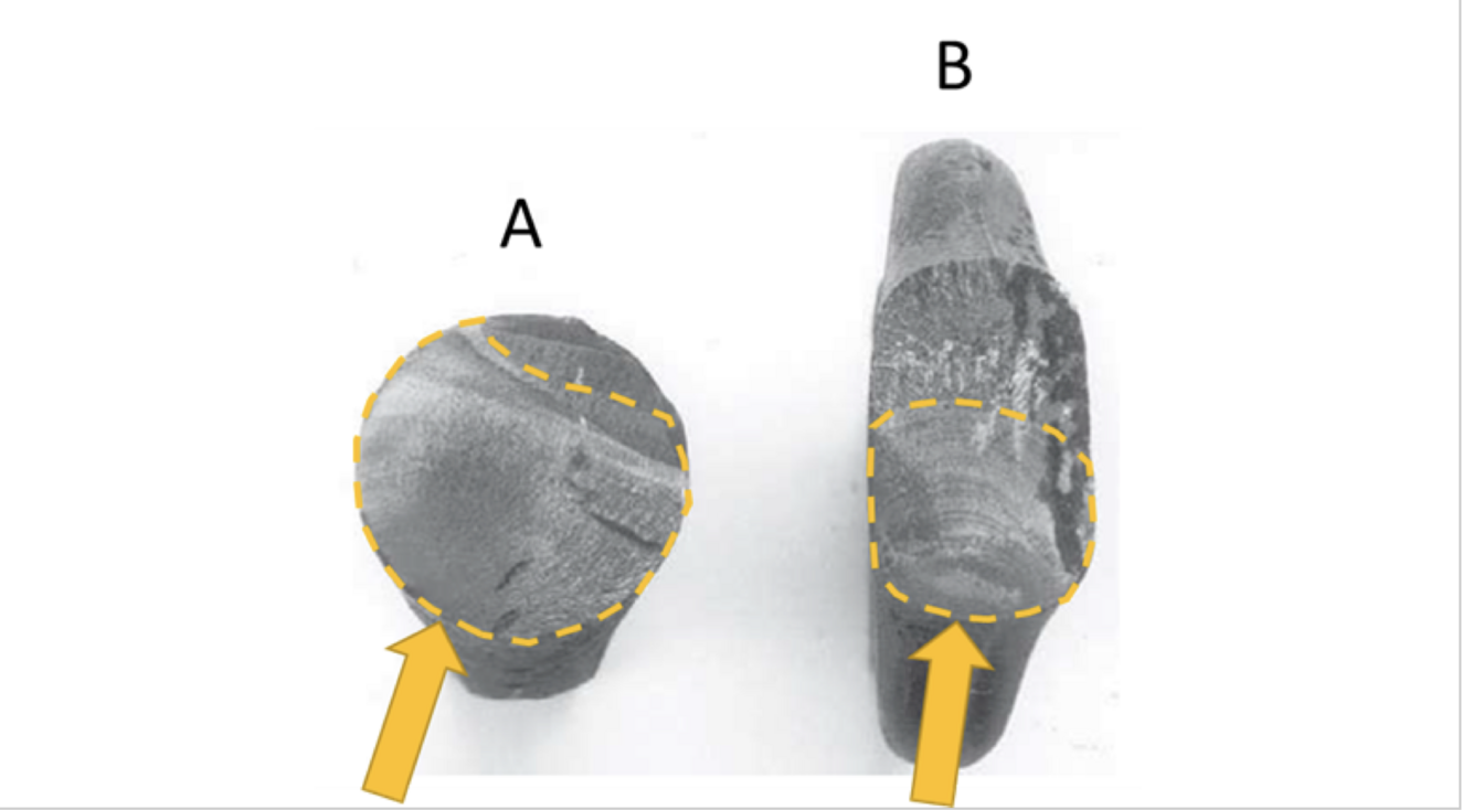 Bildet viser bruddflatene til to borhoder laget av samme type metall. Utmattingsmerker (beach marks) dekker mye av tverrsnittet som angitt med stiplet linje. Sprekkstart er angitt med pil. Hva kan man si basert på dette bildet? +1p