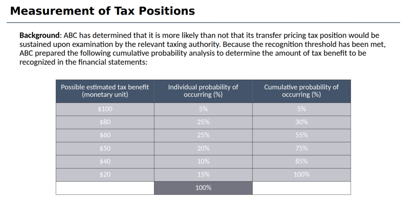 A tax position that meets the first step for recognition shall be recognized as the largest amount of tax benefit with a more than 50% cumulative probability of being realized