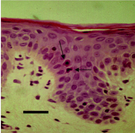 Spongionsis Sunburn Cells (Apoptotic keratinocytes) Acanthosis Hyperkeratosis Depletion of Langerhans cells Increase in the basal layer and suprabasal melanin content Inflammatory infiltrate of lymphs, neuts, and vasodilation
