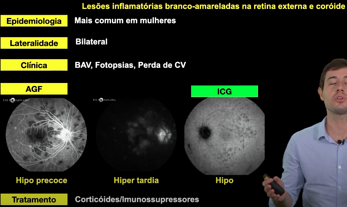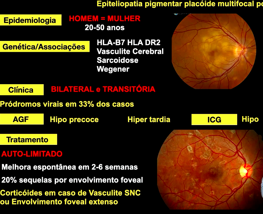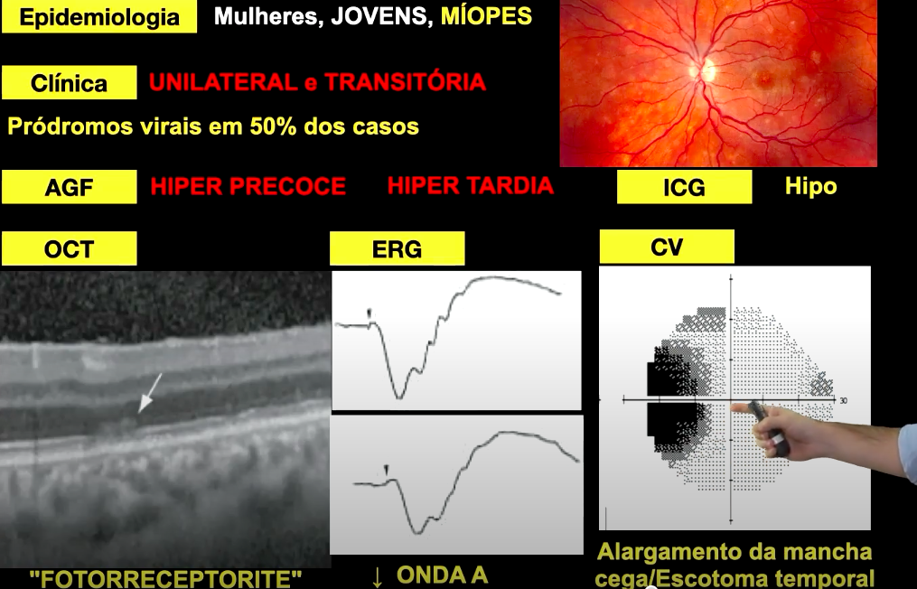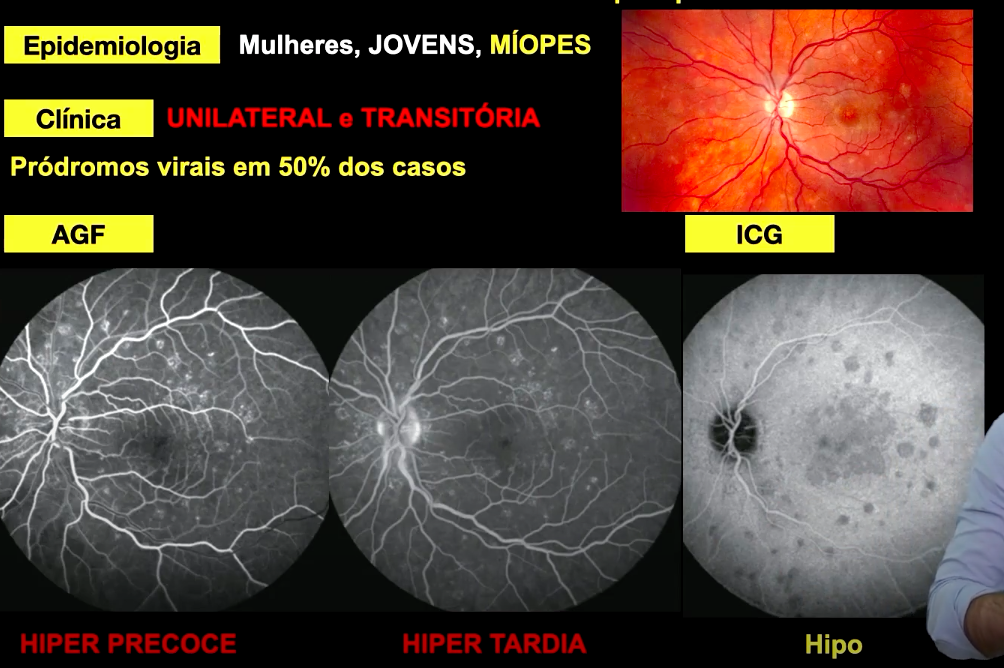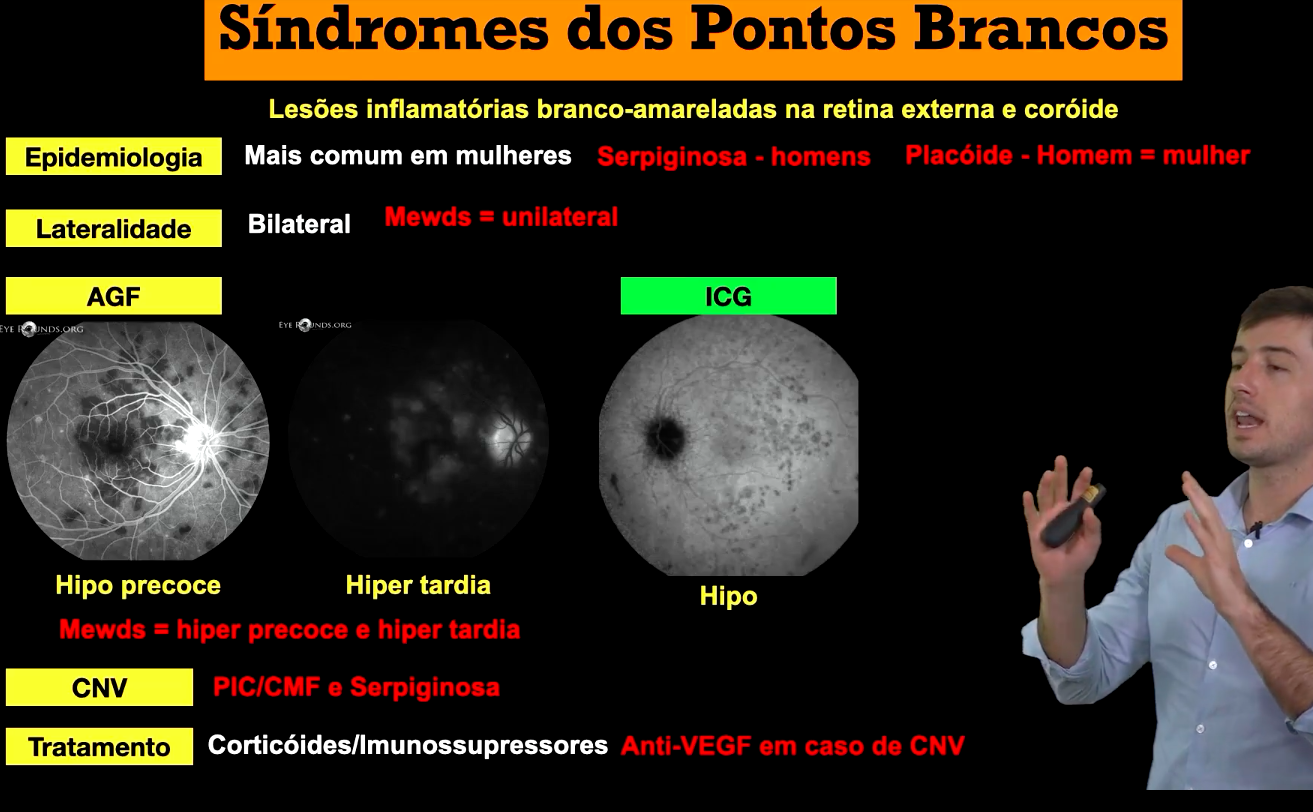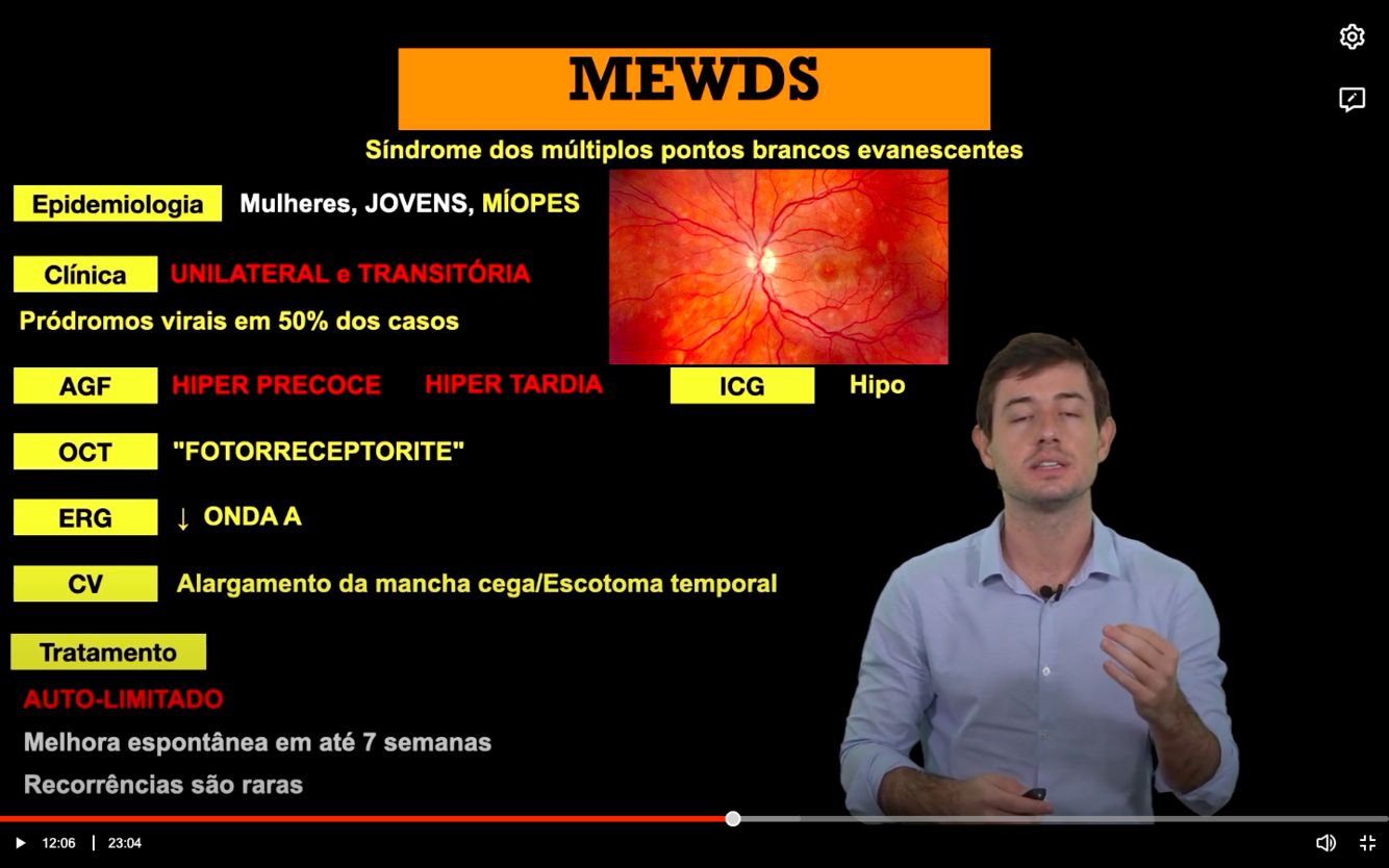 MEWDS como a “Síndrome da gripe M dos fotorreceptores”. Como assim, “Síndrome da gripe M dos fotorreceptores”? A MEWDS é classicamente conhecida por afetar Moças (mulheres jovens de 20 a 45 anos), Míopes (geralmente uma miopia baixa), cursando com quadro Monocular (unilateral, podendo afetar o olho contralateral após alguns meses, mas de forma mais leve), podendo haver aumento da Mancha cega (ou fotopsias, discromatopsias, escotomas ou baixa visual, variando de 20/20 a 20/400). Há relato de pródromo viral em cerca de 33-50% dos pacientes. Defeito pupilar aferente é comum de ser encontrado. Pode haver leve reação de câmara e vitreíte moderada, e à fundoscopia são encontrados múltiplos pontos brancos mal definidos (o que indica que estão ao nível da retina externa, no caso nos fotorreceptores e complexo EPR-fotorreceptores) que vão do polo posterior à média periferia. Ainda não foi estabelecida associação com doença sistêmica nem com nenhum anticorpo viral específico. A síndrome é auto-resolutiva e de excelente prognóstico, sendo que a maioria dos pacientes recuperam a acuidade visual prévia. Ou seja, nossa conduta é acompanhamento/observação com documentação adequada da evolução da doença