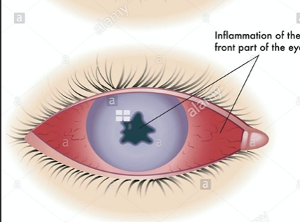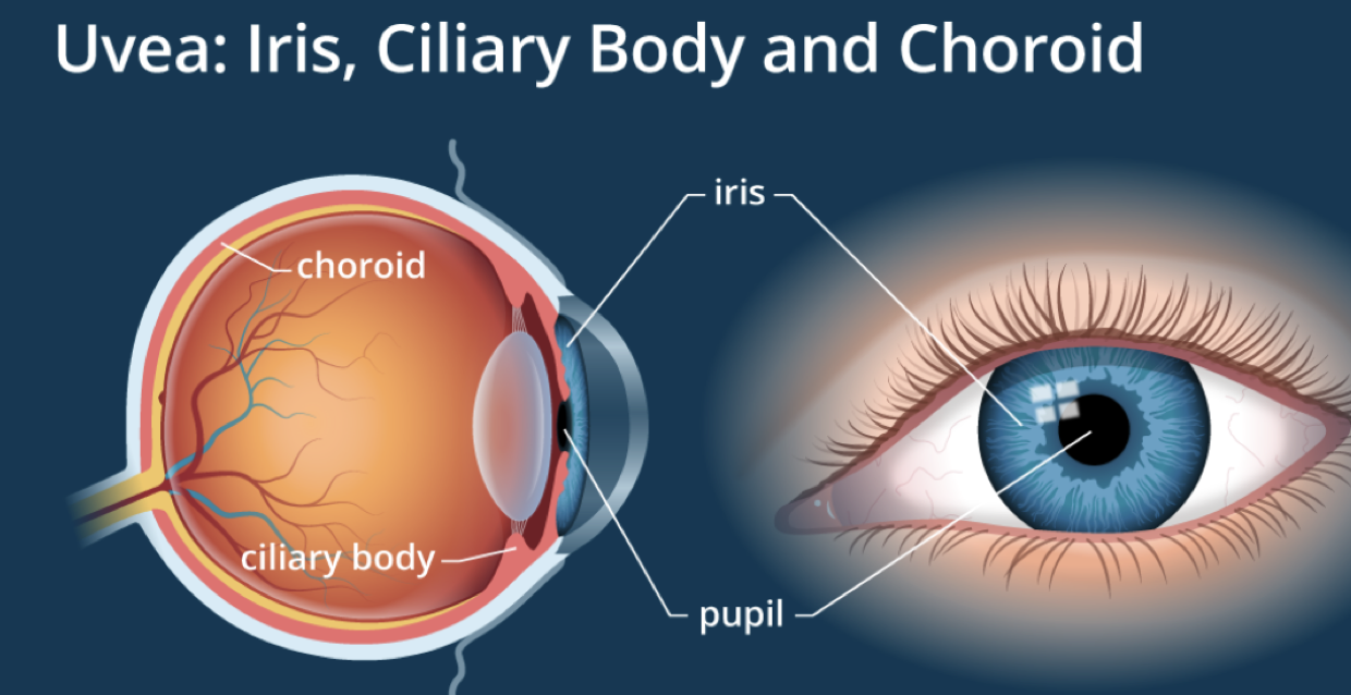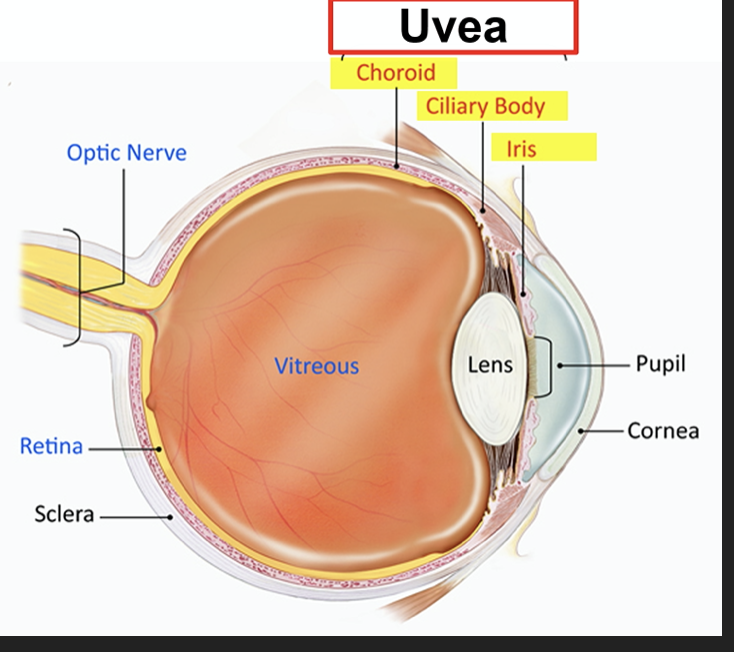 Uveitis/iritis = inflammation of the uveal tract = (iris, ciliary body, and choroid)