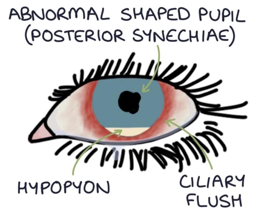 4 - Hypopyon (inflammatory cells collected as a white fluid in the anterior chamber)