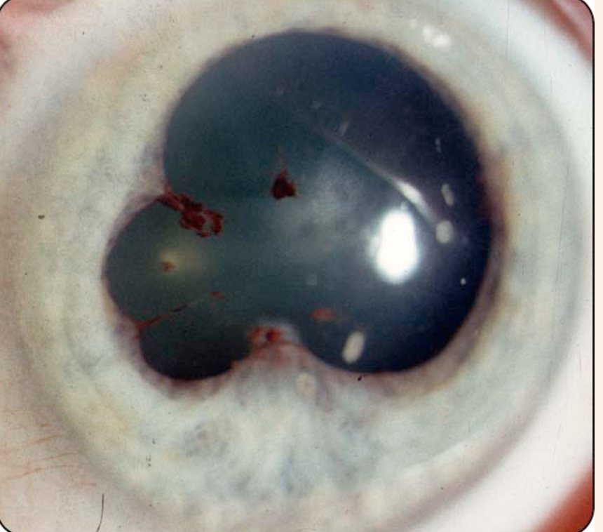 Caused by attachments to the lens known as posterior synechiae gives rise to irregular shaped iris
