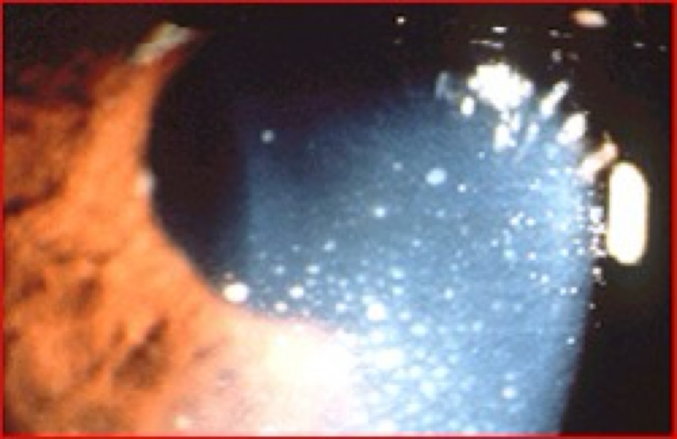 Afección corneal (úlcera dendrítica, lesión disciforme, DRQ detrás de la lesión).