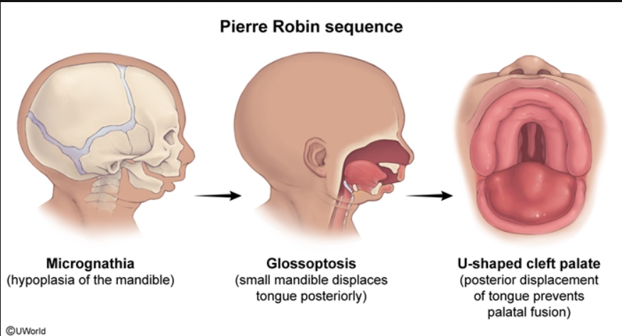 In Pierre Robin sequence, hypoplasia of the mandibular prominence leads to micrognathia. Severe micrognathia causes posterior displacement of the tongue (glossoptosis), which blocks fusion of the palatine shelves, resulting in a cleft palate that is characteristically U-shaped. Difficulty breathing occurs because the tongue prolapses into the posterior oropharynx, blocking airflow. Breathing improves when the patient is in a prone position because gravity pulls the tongue anteriorly, opening the airway.