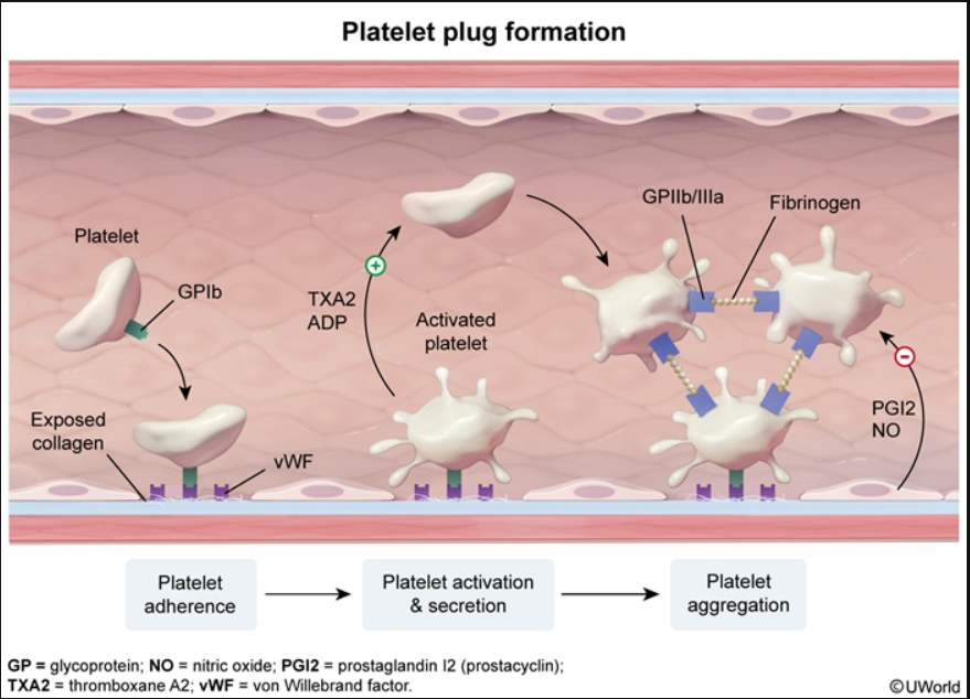 The formation of a platelet plug (primary hemostasis) is essential for preventing bleeding after damage to vascular endothelium; it occurs in 3 steps: