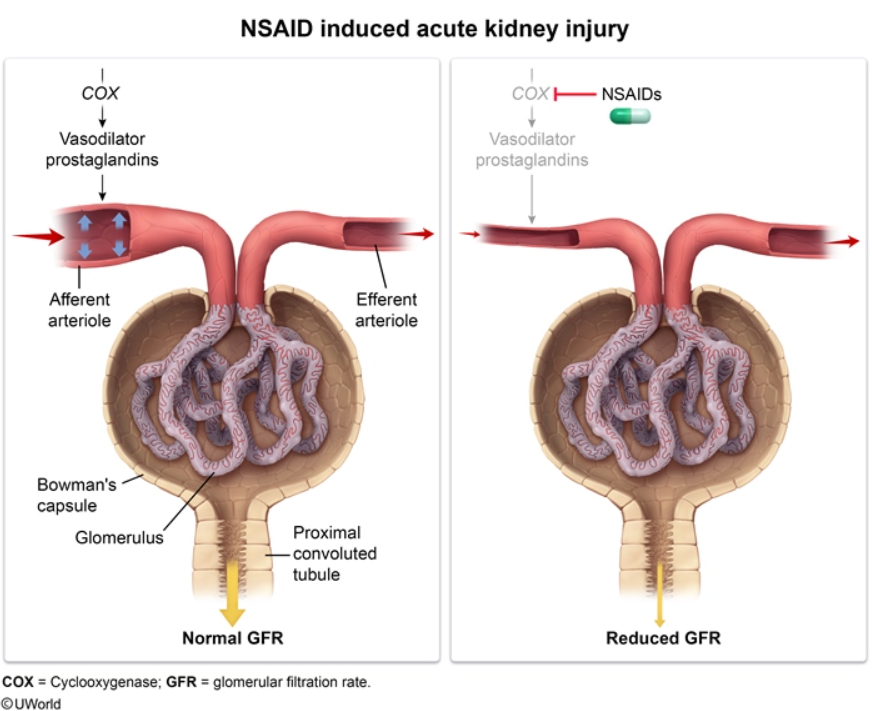 NSAIDs inhibit COX and prevent the formation of prostaglandins (prostanoids) which reduce afferent arteriole vasodilation
