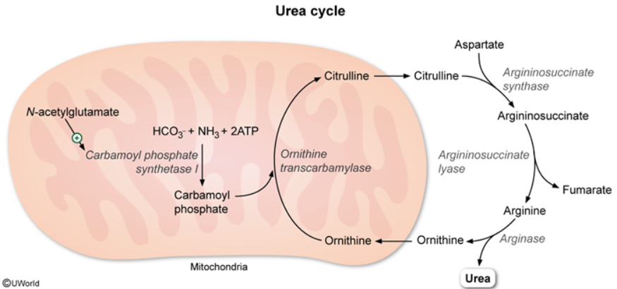 A 3-year-old boy is brought to the office due to abnormal motor development. He was born at 40 weeks gestation and had an unremarkable perinatal course. The boy developed normally during the first year of life. However, for the past 2 years, he has had progressive bilateral leg stiffness and abnormal involuntary movements. His cognitive and motor development is also delayed. There is no significant family history of neurological or muscular disorders. The patient’s height, weight, and head circumference are below the 3rd percentile. Examination shows bilateral spastic paresis of his lower extremities and frequent choreoathetoid movements. Comprehensive laboratory testing reveals significantly elevated arginine levels in plasma and cerebrospinal fluid. The deficient enzyme in this patient is normally involved in the production of which of the following?