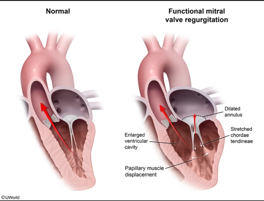 Decompensated heart failure is a common cause of secondary (functional) mitral valve regurgitation. Increased left ventricular end-diastolic volume causes dilation of the mitral valve annulus and restricted movement of the chordae tendineae with subsequent regurgitation. Treatment with diuretics and vasodilators can improve heart failure-induced MR.